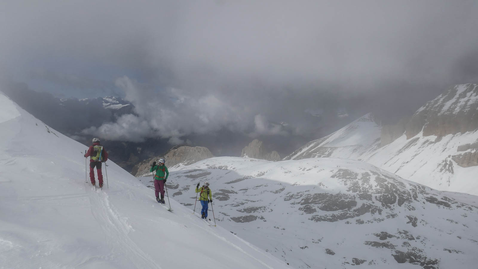 Descendemos unos 250 metros para volver a poner focas y ya llegar a la cumbre de Cotiella. Viento y frío, pero nunca defrauda. Quitamos pieles rápidamente y descendemos de nuevo para poner otra vez focas de regreso al Collado de la Pala del Puerto. La huella que hemos abierto para el flanqueo nos ayuda, pero este paso se hace largo, supongo que por el cansancio acumulado y tener que remar tanto rato (con nieve más dura se hace mejor). Quizás hubiera sido mejor soltar la talonera.