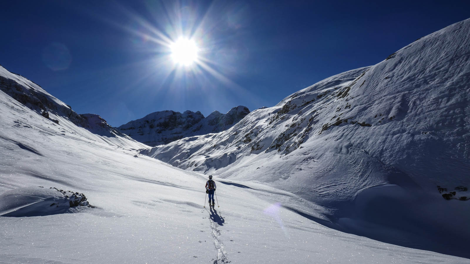 Seguimos valle arriba, pasamos las agujas y llegamos al punto clave de la ruta, que será flanquear la Pala del Puerto. Es una zona proclive a avalanchas por su orientación y su inclinación, así que aplicamos el protocolo, nos separamos y hacemos una huella que nos ayude para que a la vuelta no haya que remar demasiado. Aquí sí se nota la acumulación de nieve de ayer. Tras este delicado paso, continuamos hasta el Collado de la Pala del Puerto. Nos adentramos así en la zona de Los Amorriadores, bajo la Brecha de las Brujas, ya pudiendo divisar la cumbre de Cotiella.